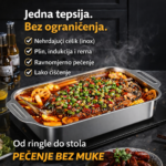 Premium roasting pan / posuda za pečenje idealna za svakodnevnu i svečanu upotrebu u kuhinji. Dizajnirana da pruži ravnomjerno pečenje i jednostavnu upotrebu, ova profesionalna posuda je savršen izbor za pečenje mesa, povrća, ribe, lazanja, pečenki i brojnih drugih jela. Ključne karakteristike Dimenzije: 42 x 26 x 6 cm — idealna veličina za porodične obroke i veće komade mesa. Materijal: visokokvalitetni nerđajući čelik – izdržljiv, otporan na rđu i jednostavan za održavanje. Rebrasto dno: omogućava bolju cirkulaciju toplote i smanjuje prianjanje hrane. Ergonomske ručke: čvrste ručke za sigurno držanje i prenošenje, čak i kada je posuda puna. Višenamjenska upotreba: odlična za pečenje u rerni, pripremu jela i — posebno — elegantno posluživanje direktno na stolu. Lako čišćenje: materijal bez toksičnih premaza omogućava brzo i jednostavno održavanje. Zašto je posebna? Osim što osigurava vrhunske rezultate prilikom pečenja, ova posuda je dovoljno elegantna da se koristi i kao servirna tacna. Zbog modernog dizajna od nerđajućeg čelika izgleda odlično na svakoj trpezi, što je čini savršenom za porodična okupljanja, svečane ručkove i prezentaciju gotovih jela.